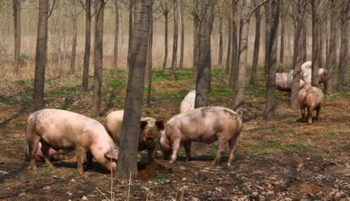 禹田生態放牧豬每天都是自己跑到山上去采食,在山上吃些雜草、作物秸稈和一些野果等。這些放牧豬每天在山上的活動時間是八個小時以上,吃完了撒個歡兒、賽個跑、洗個泥巴浴,日子過得無拘無束、悠然自得。散放飼養的豬要在山上長一年之后才會屠殺,完全是原生態自然生長,從未喂過含任何快速生長激素的合成飼料。